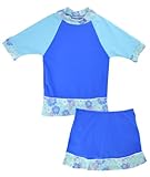 Two piece swim suit. Short sleeve top and bikini attached under the skirt.Two tone color combination plus our exclusive print is featured on the top and skirt. Solid bikini bottom matches the skirt solid fabric plus it's also lined. Designed to provide protection from damaging sun rays without compromising fashion or comfort.All TUGA tops are designed with a 'high neck' style to offer the most sun protection. Outfit is made from high quality, tested fabric and utilizes attractive prints and cuts for a great look that protects all day long. Suits are made from chemical-free fabrics with UPF 50+ protection, which offers maximum sun protection! SIZING: Use age as a starting point for children. Weight and height are the best guides to go by. All our clothing is designed to fit loosely in order to provide the highest sun protection possible. Please check our TUGA SUNWEAR size charts to ensure the best fit.